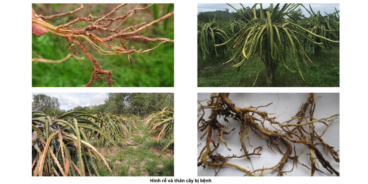 Triệu chứng: Cây còi cọc, cành vàng, rụng hoa sớm, khi nhổ lên thấy rễ bị thối đen, mềm nhũn.